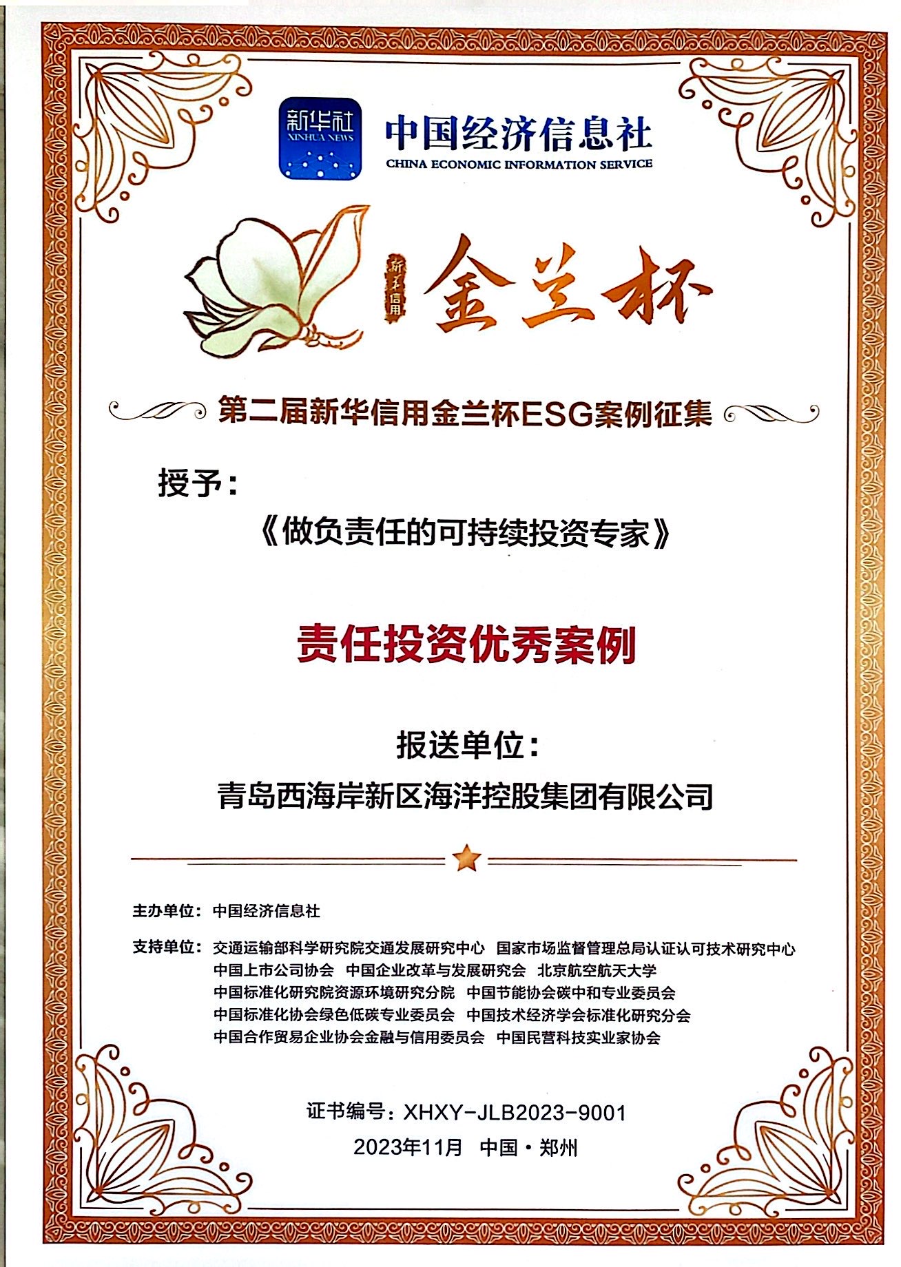11月13日,第五屆中國城市信用建設高峰論壇企業ESG與高質量發展論壇在鄭州舉辦。活動現場,第二屆新華信用金蘭杯ESG優秀案例名單發布。青島西海岸新區海洋控股集團(以下簡稱“海控集團”)憑借在新興產業培育、產業轉型升級、綠色投資等方面的卓越表現,獲評“第二屆新華信用金蘭杯責任投資優秀案例”。