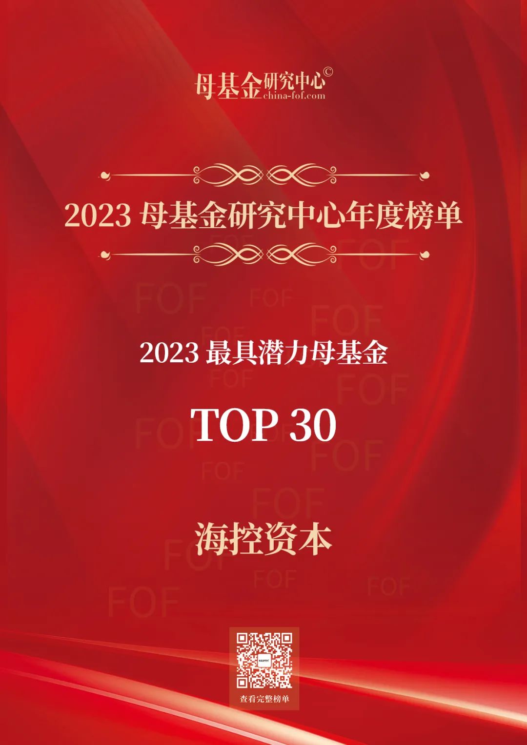 2023年12月11日,2023母基金研究中心年度榜單隆重揭曉,海控資本獲評「2023年最具潛力母基金TOP30」。