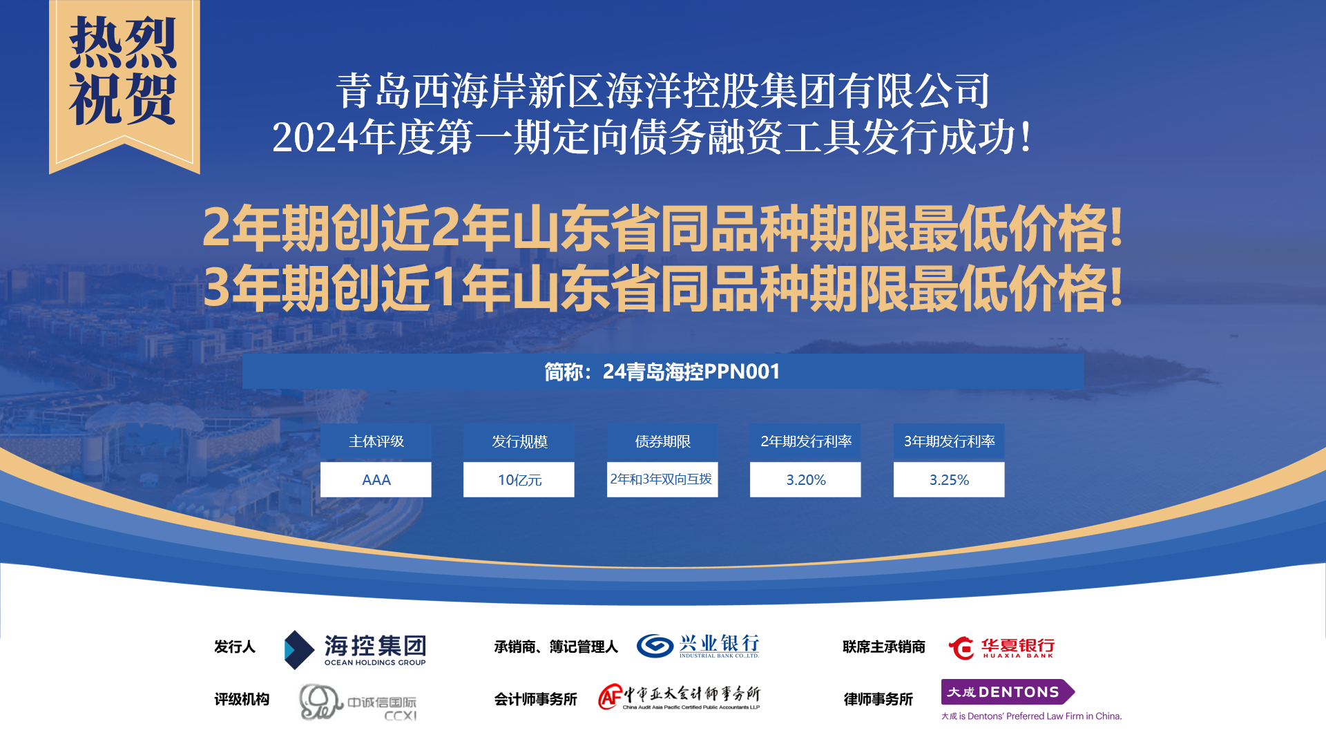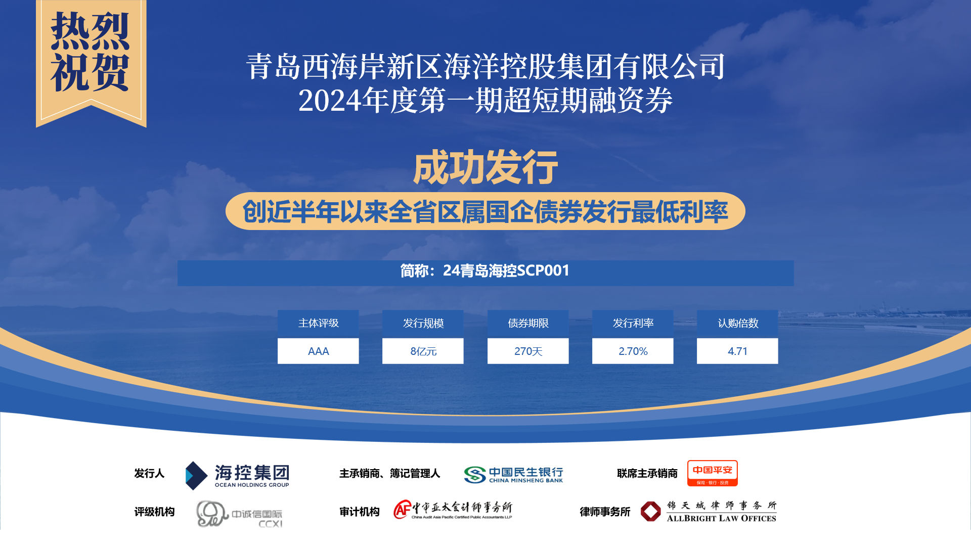 集團2024年債券發行“開門紅”體現了資本市場對海控集團的高度認可。海控集團將繼續深化產業化轉型成果,拓展多元融資渠道,為西海岸新區高質量發展做出更大貢獻。