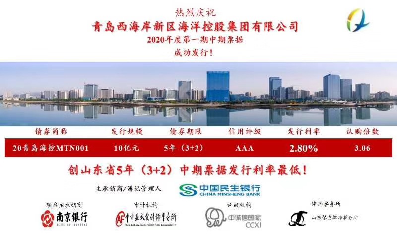 近日,海控集團(tuán)2020年第一期中期票據(jù)在銀行間交易市場(chǎng)成功發(fā)行,發(fā)行金額10億元,期限5(3+2)年,發(fā)行利率2.80%,創(chuàng)山東省國有企業(yè)同期限中期票據(jù)發(fā)行票面利率最低。此次中期票據(jù)的成功發(fā)行,是海控集團(tuán)與民生銀行戰(zhàn)略合作的成果,同時(shí)作為海控集團(tuán)首次在公開市場(chǎng)亮相,受到資本市場(chǎng)高度關(guān)注,有助于提升海控集團(tuán)發(fā)展實(shí)力和資本市場(chǎng)認(rèn)可度,為服務(wù)經(jīng)略海洋戰(zhàn)略發(fā)展奠定基礎(chǔ)。