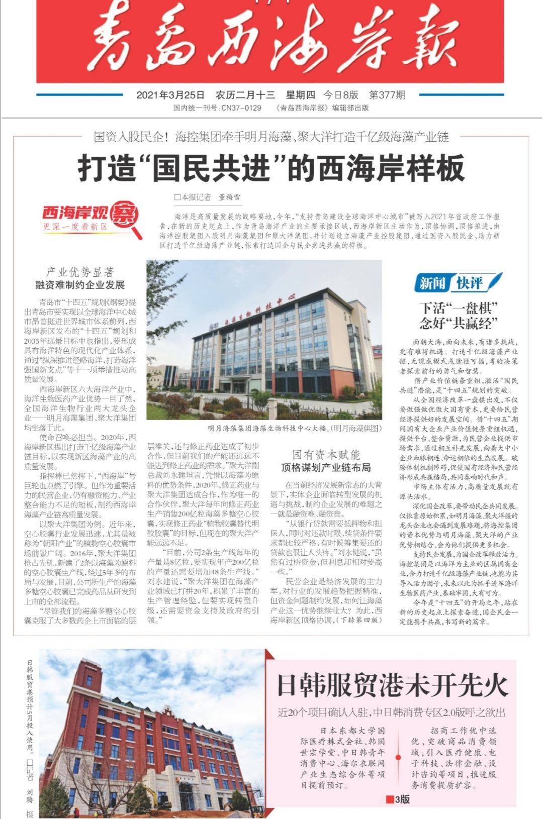 海洋是高質(zhì)量發(fā)展的戰(zhàn)略要地,今年,“支持青島建設(shè)全球海洋中心城市”被寫入2021年省政府工作報告,在新的歷史起點上,作為青島海洋產(chǎn)業(yè)的主要承接區(qū)域,西海岸新區(qū)主動作為,頂格協(xié)調(diào),頂格推進,由海洋控股集團入股明月海藻集團和聚大洋集團,并計劃設(shè)立海藻產(chǎn)業(yè)控股集團,通過國資入股民企,助力新區(qū)打造千億級海藻產(chǎn)業(yè)鏈,探索打造國企與民企共進共贏的樣板。